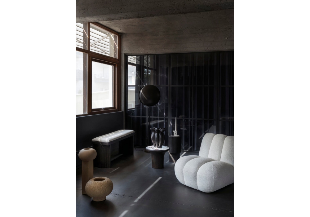 Toe firmata da Kristian Sofus Hansen & Tommy Hyldahl per 101 Copenhagen è una poltrona imbottita con rivestimento in tessuto bouclé bianco sporco.