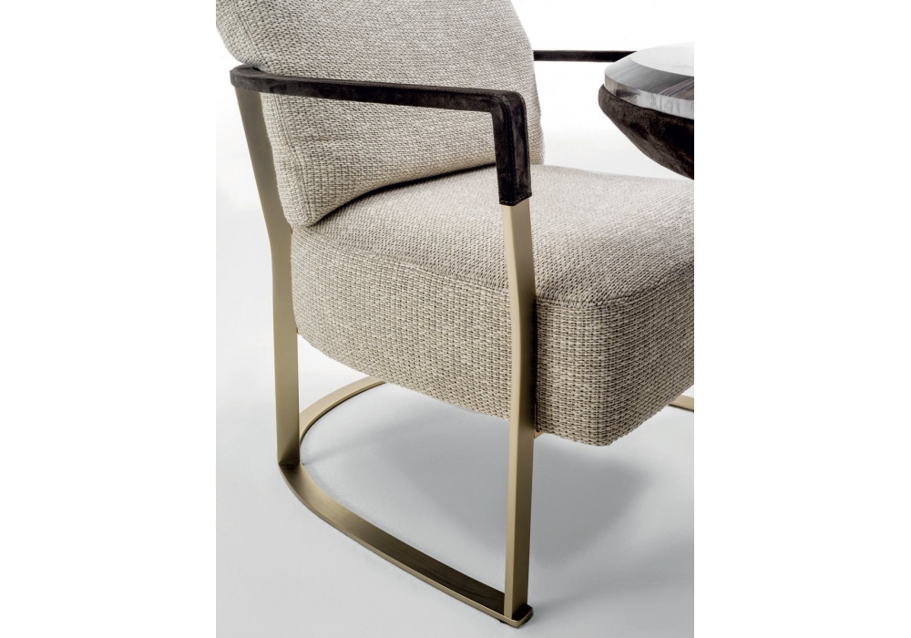 Kathryn firmata da Giuseppe Viganò per Longhi è una poltrona con schienale in legno massello rivestito in pelle incollata a caldo con lavorazione manuale e parti metalliche tagliate al laser con finitura lucida op opaca. Cuscino seduta in legno e poliuretano espanso a triplice quota di densità rivestito in pelle o tessuto non sfoderabile. Cuscino schienale in piuma d’oca sterilizzata con inserto in poliuretano espanso a quota morbida e rivestito in pelle o tessuto sfoderabile.