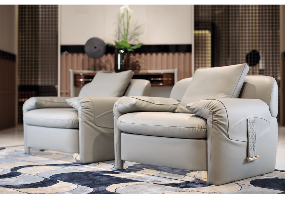 Eclipse firmata da Andrea Bonini per Turri è una poltrona con struttura in legno massello e multistrato con Poliuretano espanso e rivestimento in differenti tessuti o pelli. Dettagli decorativi in metallo in finitura oro chiaro.