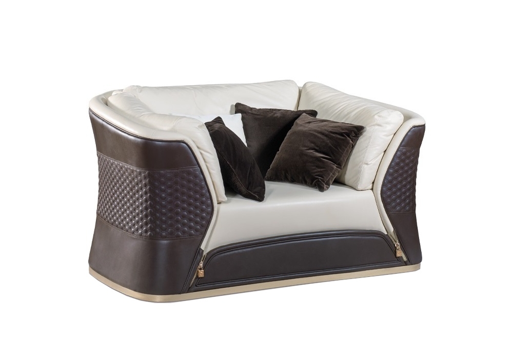 Vogue firmata da Andrea Bonini per Turri è una poltrona con struttura in legno massello e multistrato imbottito con poliuretano espanso a quote differenziate. Scocca in pelle ricamata esagono e cuscinatura in differenti pelli o tessuti. Base e dettagli decorativi in metallo dorato.