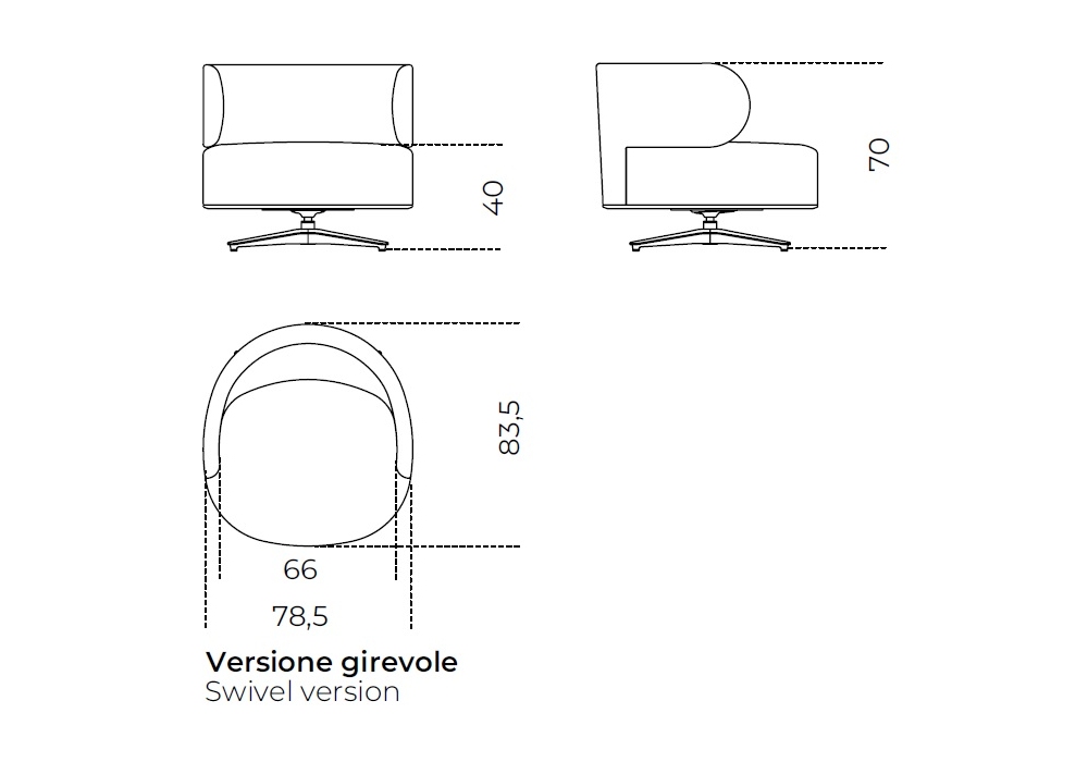 Akiko Lounge firmata da Oscar & Gabriele Buratti per Gallotti&Radice è una poltrona con movimento girevole a 180° con ritorno con basamento a 4 razze in metallo verniciato color “warm grey” con finalini. Rivestimento in tessuto o pelle nei colori del campionario.