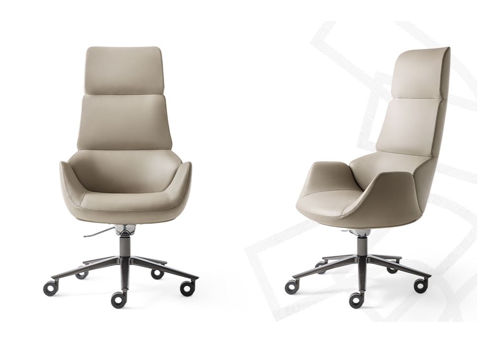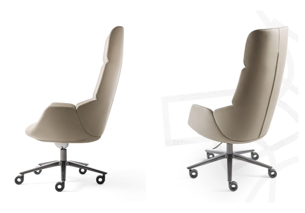 Calathea firmata da Roberto Lazzeroni per Giorgetti è una bergère direzionale, con base in metallo Pewter. Rivestimento in pelle, realizzabile anche in due colori differenti per la scocca e l'interno. La base è girevole con ruote, regolabile in altezza.