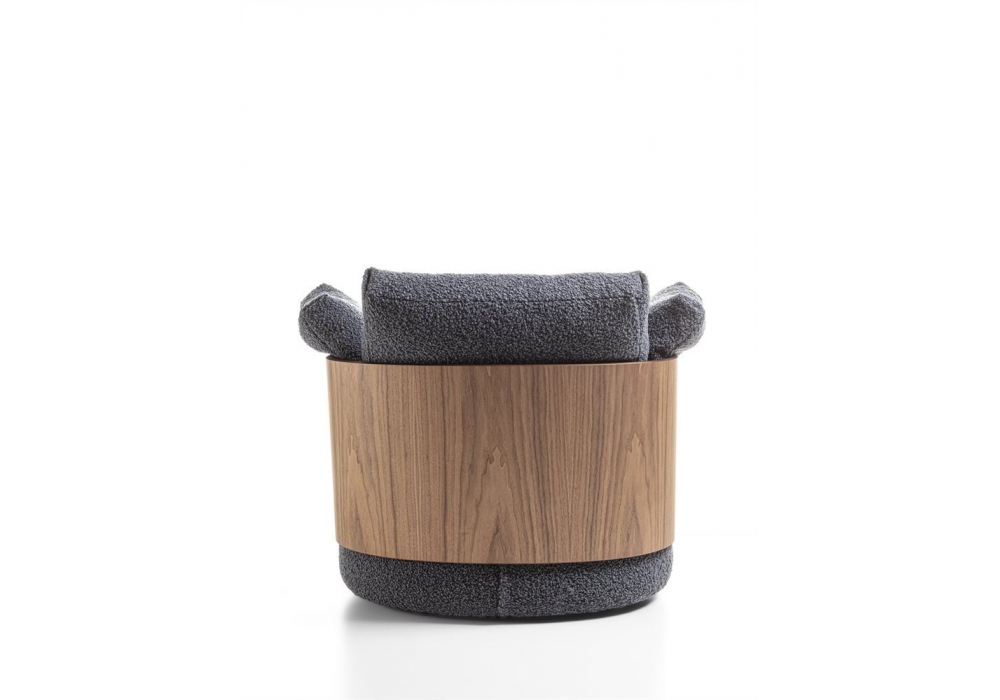 Calin firmata da Gabriele & Oscar Buratti per Porada è una poltrona realizzata con basamento girevole in metallo e schienale in multistrato curvato con bordo a vista in finitura noce canaletta. Seduta e schienale imbottiti con fibra sintetica con rivestimento sfoderabile in tessuto. Cuscini laterali opzionali.