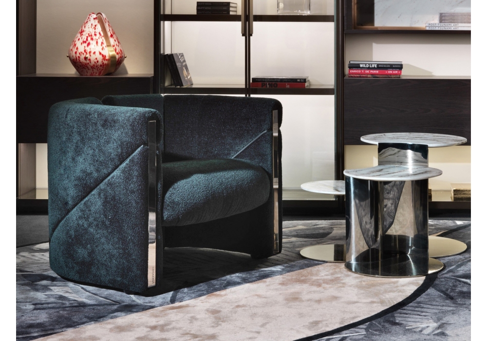 Petra firmata da Alessandro La Spada per Visionnaire è una poltrona imbottita con poliuretano rivestito in tessuto. Schienale e braccioli decorati con elementi strutturali verticali in acciaio con finitura laccata. Struttura esterna con motivo a mosaico con filetto rivesito in pelle nera. Petra è disponibile in differenti finiture.