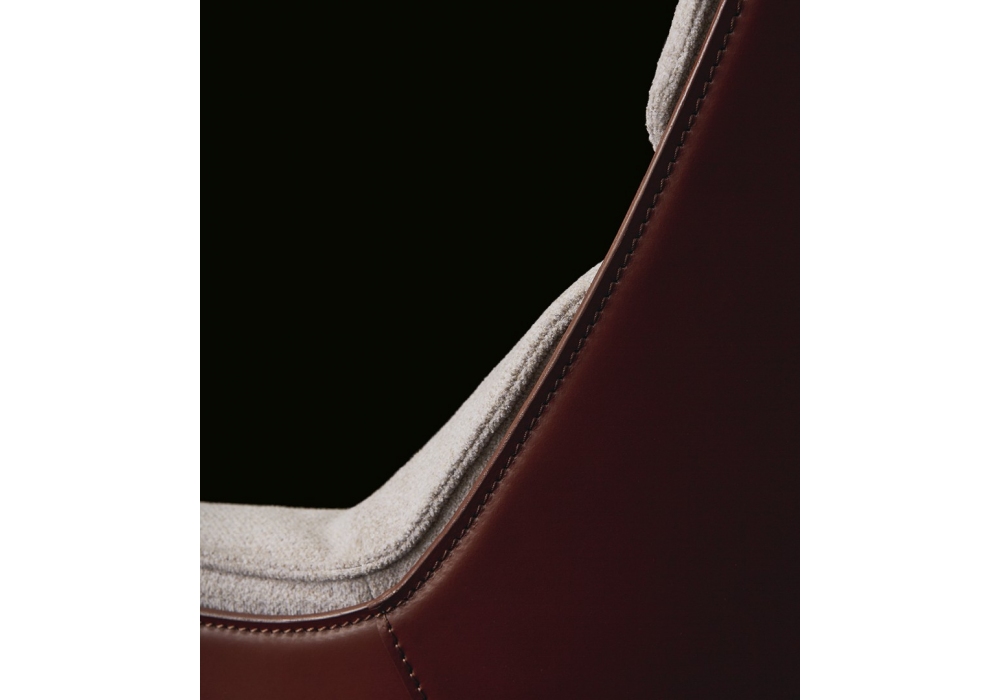 Kaori Lounge firmata da Jean Marie Massaud per Poliform è una poltrona con scocca in poliuretano compatto con inserto in poliuretano flessibile. Cuscino seduta in poliuretano flessibile a quote differenziate e prerivestimento parti in tela cotone con piuma. Sottosedile in legno e derivati rivestito in cuoio colori. Basamento girevole con ritorno o fisso, in acciaio verniciato brown nickel opaco, piedi in alluminio verniciato brown nickel opaco. Rivestimento non sfoderabile scocca esterna in cuoio colori, rivestimento sfoderabile scocca interna e seduta in tessuto.