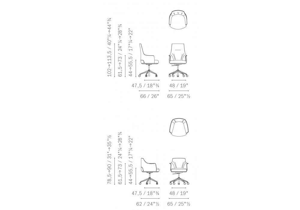 | Dimensioni | 65 x 66 x H 78,5/90 cm (Executive); 65 x 66 x H 102/113,5 cm (Managerial). |