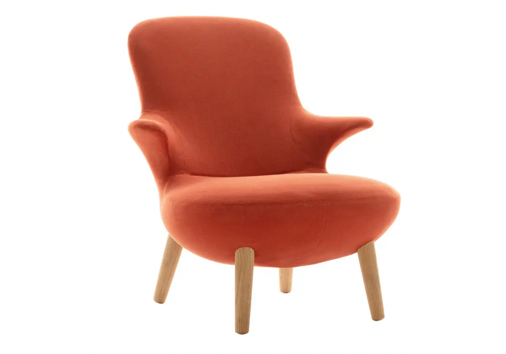 Omoi firmata da Naoto Fukasawa per B&B Italia è una poltrona con telaio interno in tubolari d'acciaio con imbottitura in schiuma di poliuretano con fodera in fibra di poliestere. Gambe in legno massello di rovere. Rivestimento in differenti tessuti o pelli con doppie cucinture tono su tono.