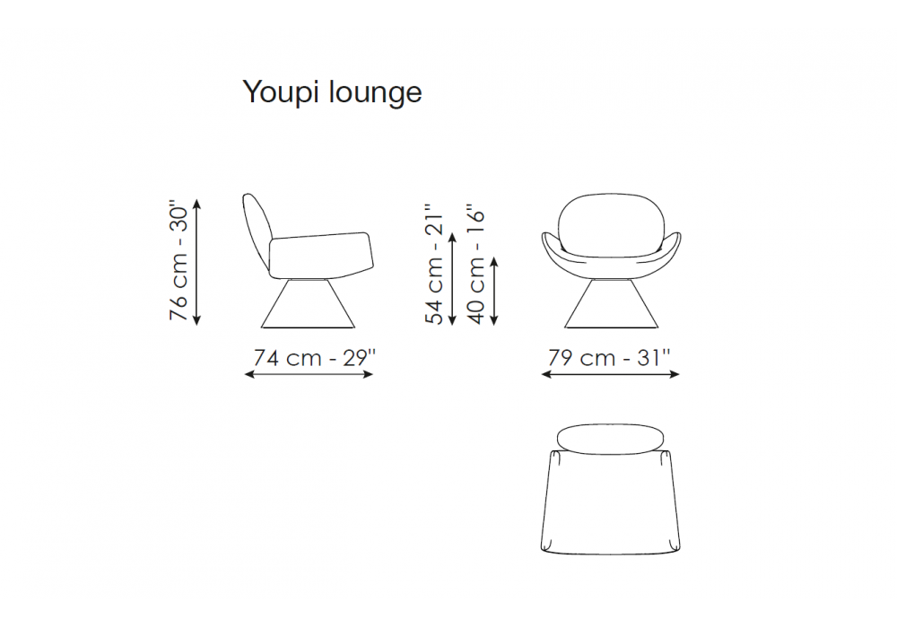 Youpi Lounge firmata da Fabrice Berrux per Bonaldo è una poltrona con struttura in poliuretano schiumato a freddo con rivestimento in tessuto o pelle. La base è girevole rivestita nello stesso tessuto/pelle selezionato.