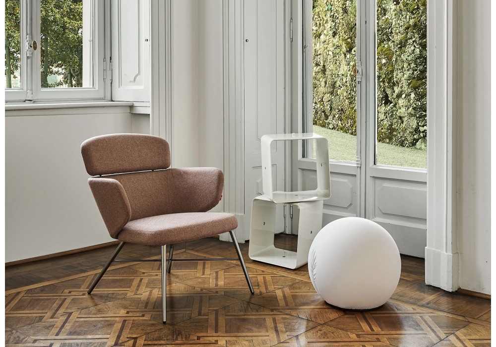 Kin Lounge firmata da Radice Orlandini per Baleri Italia è una poltrona lounge con struttura in tubo di acciaio verniciato in polvere epossidica nei colori indicati. Schienale in poliuretano flessibile schiumato a freddo. Rivestimento non sfoderabile in tessuto o pelle. Piedini in polietilene nero.