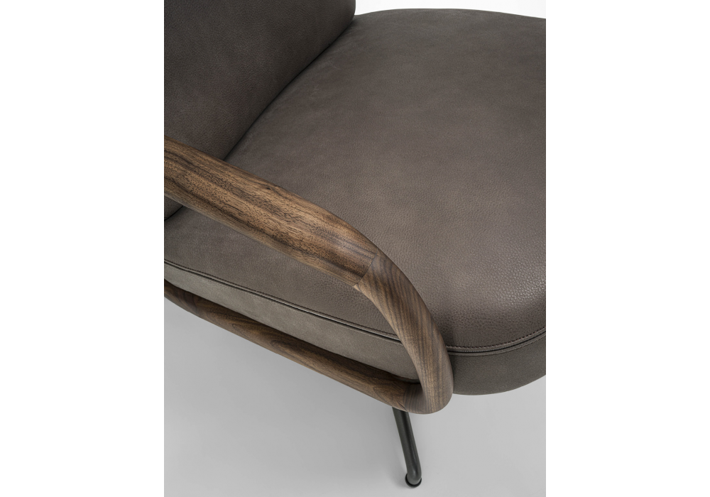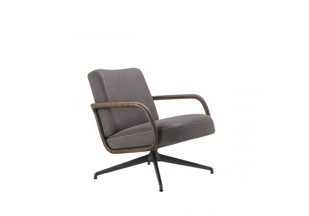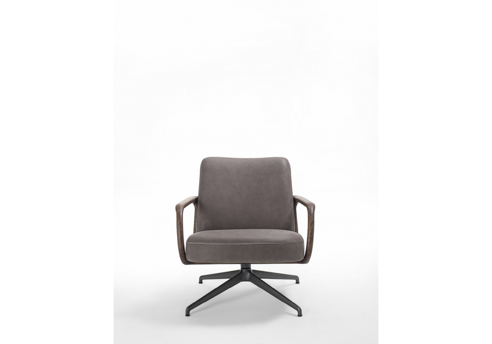 Cuna Lounge Low firmata da Emmanuel Gallina per Porada è una poltrona con schienale basso e basamento in metallo girevole con meccanismo di ritorno. Struttura interna schienale e seduta in multistrato, rivestimento esterno nei tessuti della collezione e cordonetto negativo affogato tra le due cuciture. Scocca esterna in massello di noce canaletta con braccioli integrati. Possibilità di abbinare Cuna Lounge pouf.