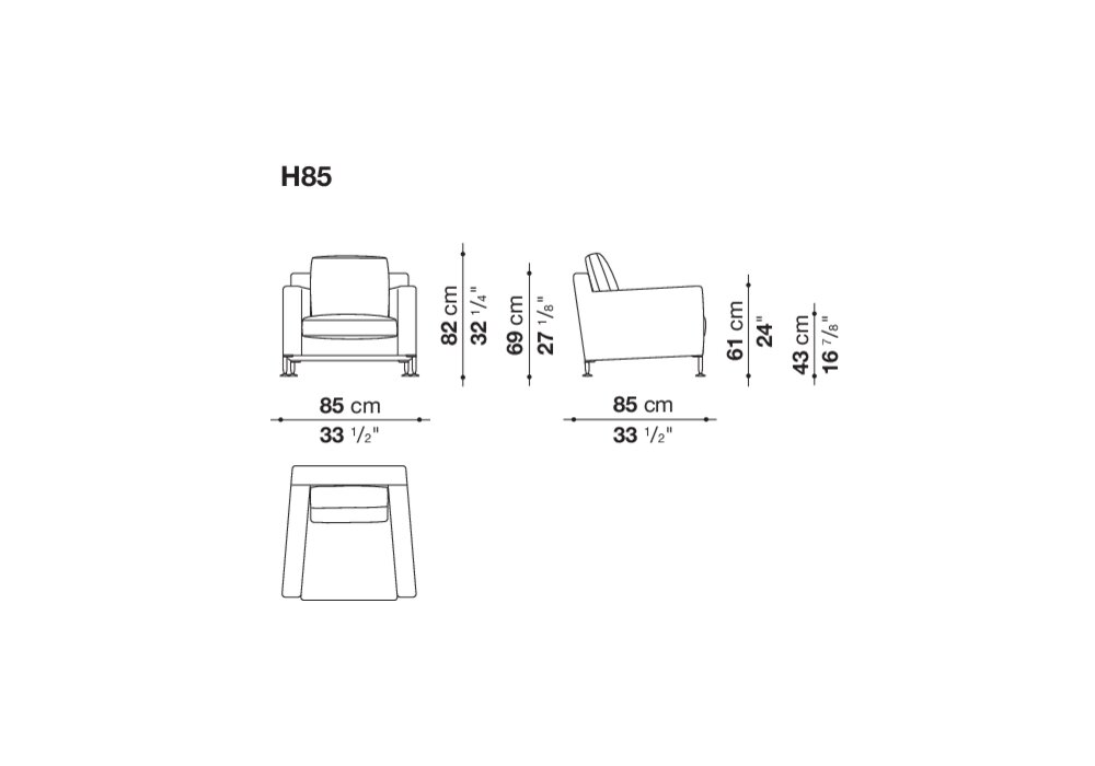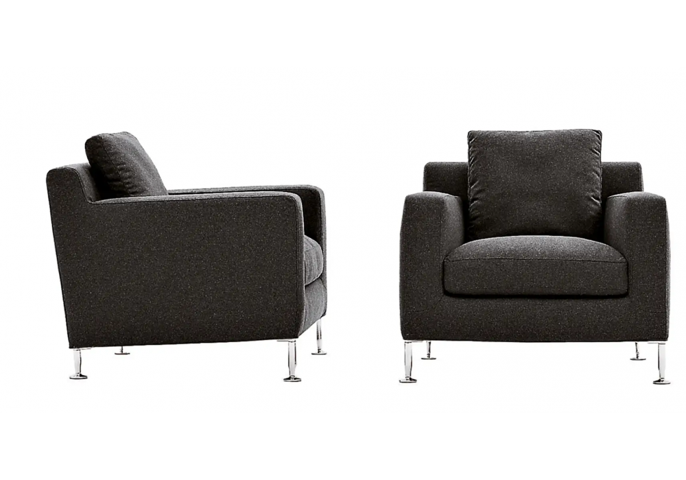 Harry firmata da Antonio Citterio per B&B Italia è una poltrona con telaio interno caratterizzato da tubolari e profilati d'acciaio e imbottitura in schiuma di poliuretano flessibile a freddo Bayfit® con fodera in fibra di poliestere. Rivestimento in differenti tessuti o pelli. Piedini in lamiera ed estrusi d'alluminio.