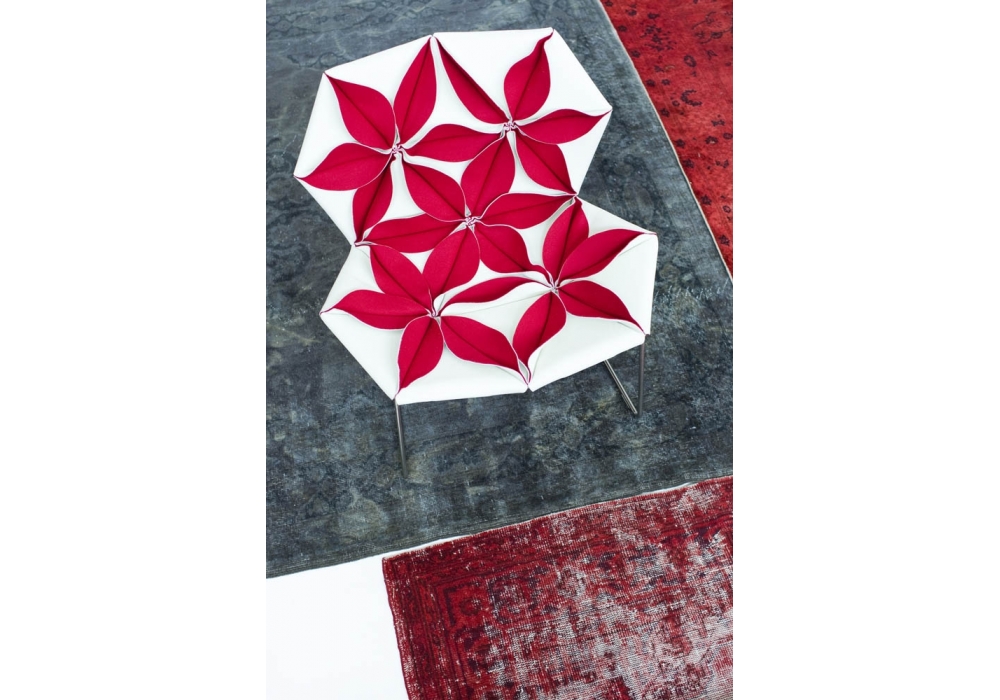 Antibodi firmata da Patricia Urquiola per Moroso è una poltrona multicolor con petali con base in acciaio inox e sottopiedi in PVC. Fodera bicolore di panno, autoportante, accoppiata a poliuretano espanso e rete tecnica.