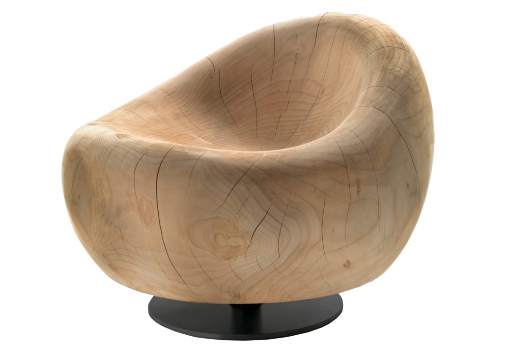 Maui firmata da Terry Dwan per Riva 1920 è una poltrona con base girevole con gamba tubolare e piastra in ferro e scocca in legno massello di cedro profumato lavorata da un blocco unico.