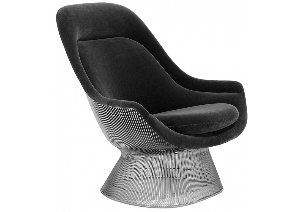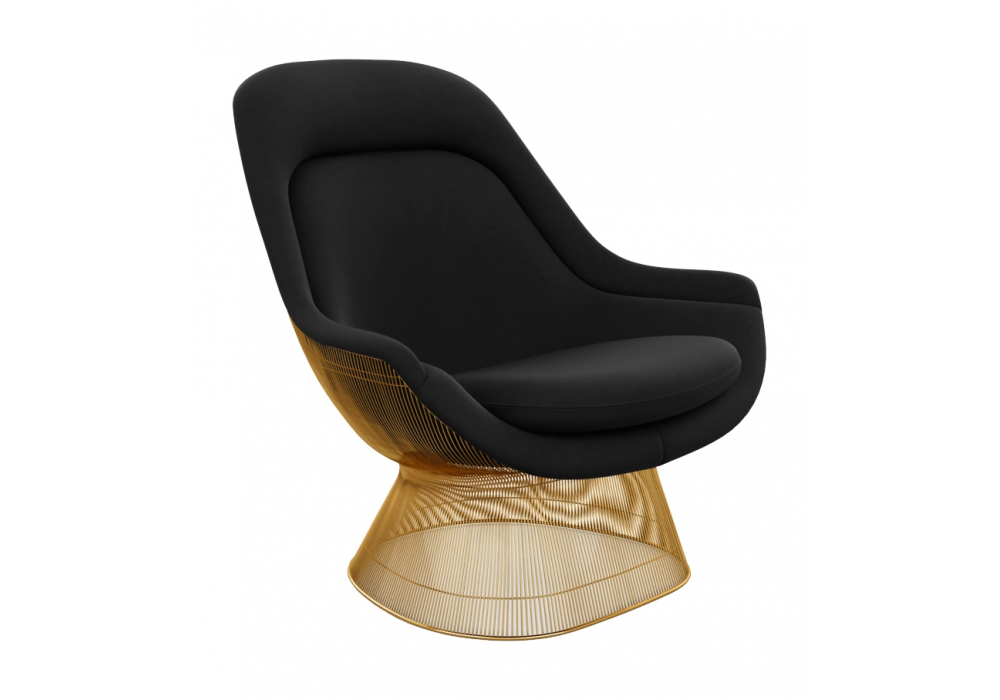 Platner easy chair firmata da Warren Platner per Knoll è una poltrona con struttura costituita da tondini metallici sagomati in verticale ed orizzontale, trattati con nichelatura e finitura di protezione trasparente, o finitura in oro 18k. Base bordata con estruso plastico trasparente per proteggere il pavimento. Conchiglia stampata in fiberglass con cuscini in espanso a densità variabile. I cuscini del sedile sono rivestiti in tessuto e sono dotati di cerniera lampo; fissati alla struttura con bottoni di velcro.