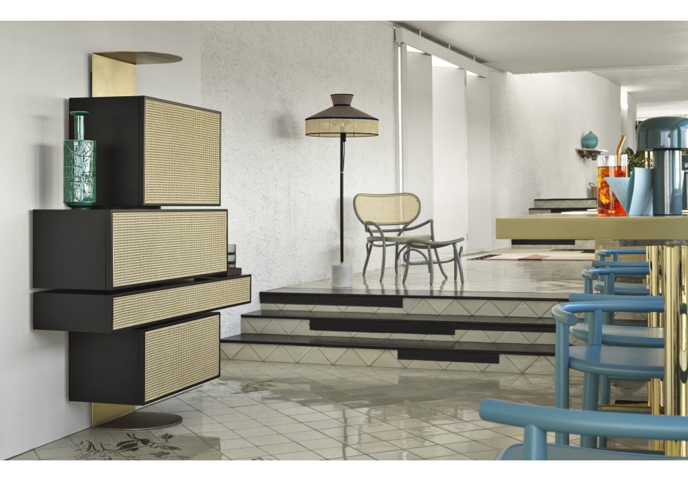 Lehnstuhl firmata da Nigel Coates per Gebrüder Thonet Vienna è una lounge chair realizzata in faggio curvato. Seduta e schienale in paglia di Vienna a maglia larga.