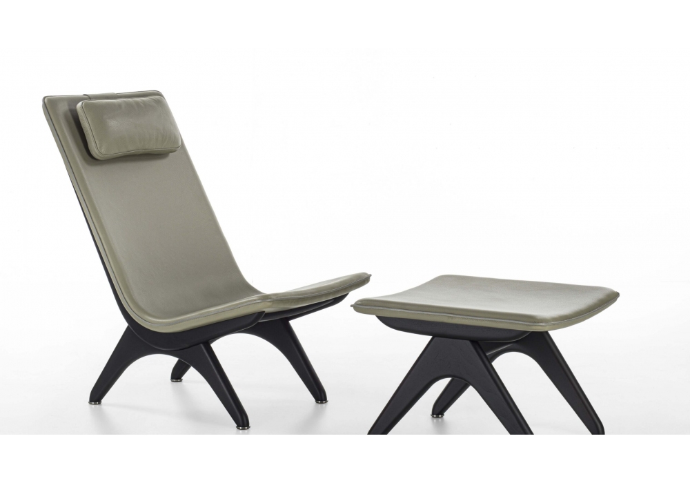 Koko firmata da Tollgard & Castellani per Porada è una poltrona con struttura portante in massello di noce canaletta con scocca asimmetrica modellata con uno strato di poliuretano. Rivetsimento in differenti finiture di pelle o tessuto.
