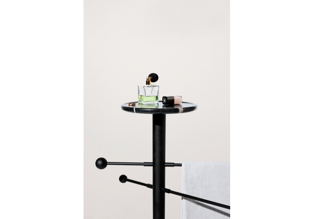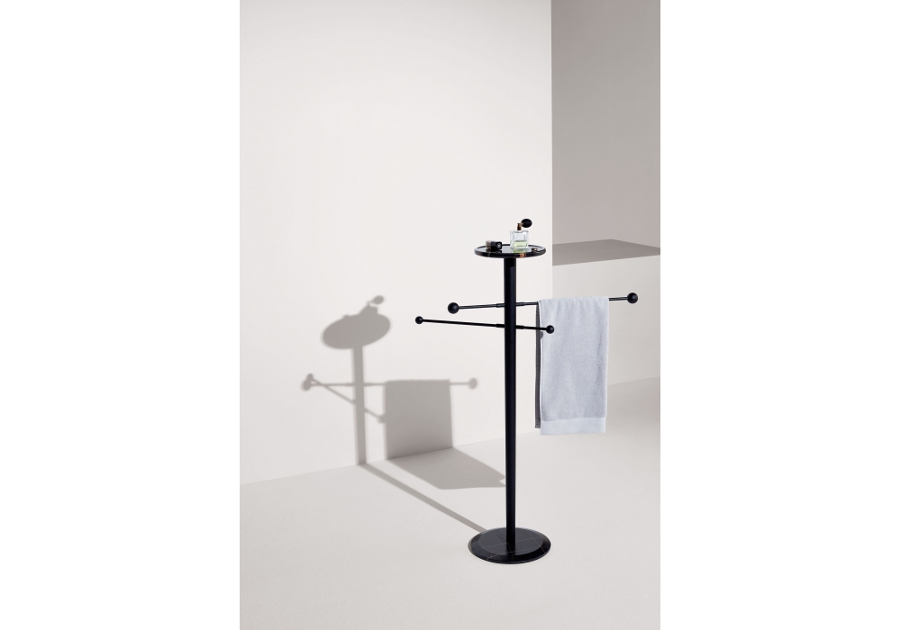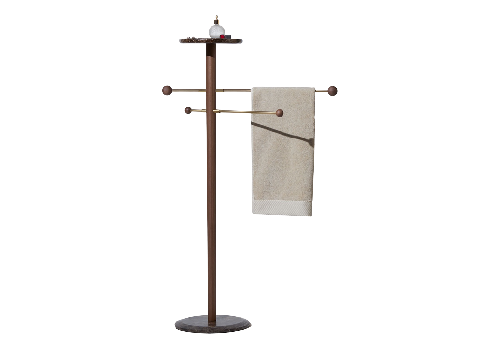 Toallero firmato da Andrés Martinez per Nomon è un portasciugamani con struttura in noce o frassino nero, dettagli in ottone lucido o verniciato nero. La base è in marmo Emperador o Sahara Noir.