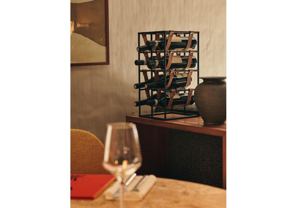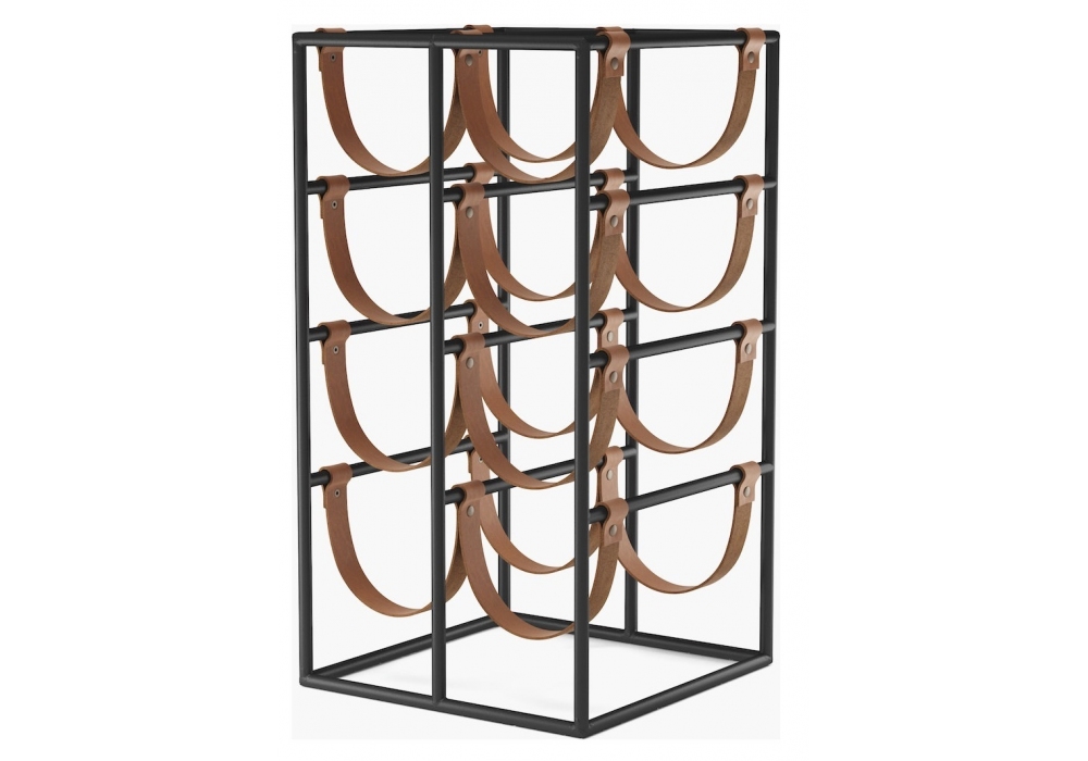 Umanoff firmato da Arthur Umanoff per Audo Copenhagen è un portavini realizzato in acciaio verniciato a polvere nero e pelle nella finitura Cognac.