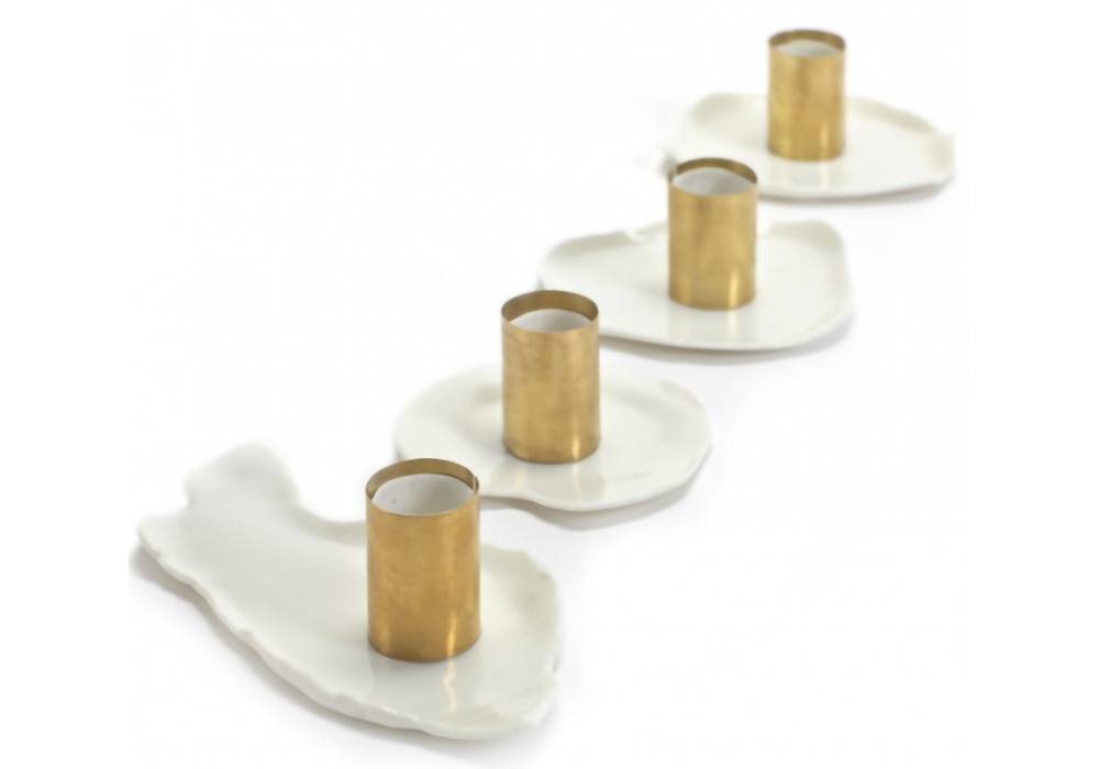 Marie firmato da Marie Michielssen per Serax è un set di 4 portacandele strutturate da una base dalla forma astratta in ceramica ed un sostegno per candele in rame.