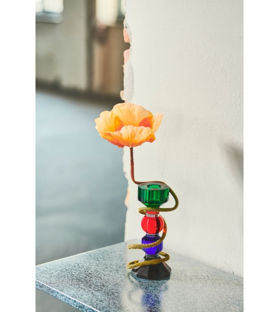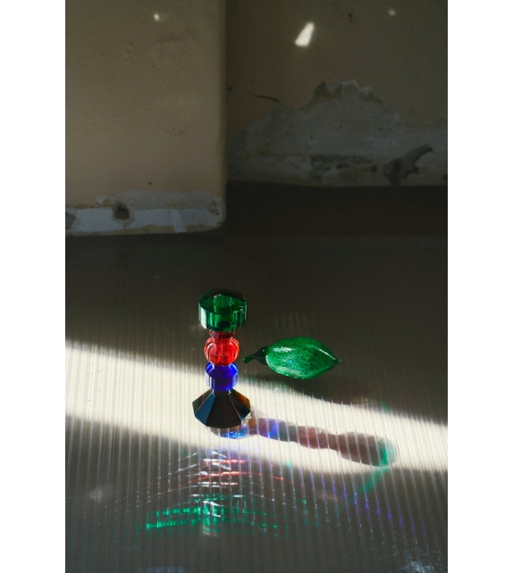 Aya prodotto e firmato da Reflections Copenhagen è un porta candele in cristallo strutturato da vari elementi geometrici intagliati e rifiniti a mano di colore marrone, trasparente, cobalto, rosso, arancio e verde.