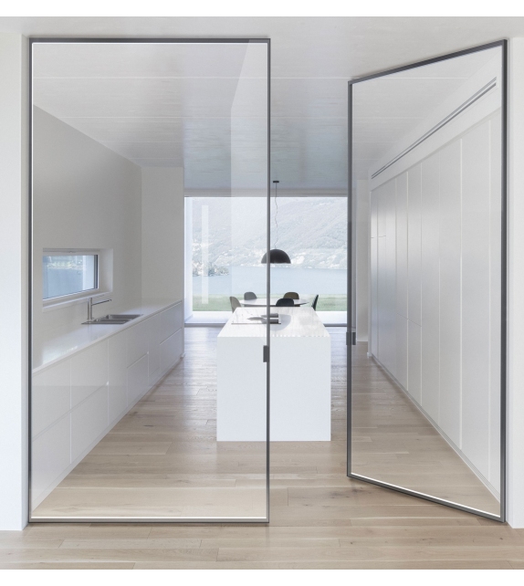 Como Pivot Vetro Doppio firmata da Viva è una porta bilico in vetro e profili in alluminio. Disponibile in diverse finiture. Maniglia e meccanismo inclusi. Versione vetro doppio.