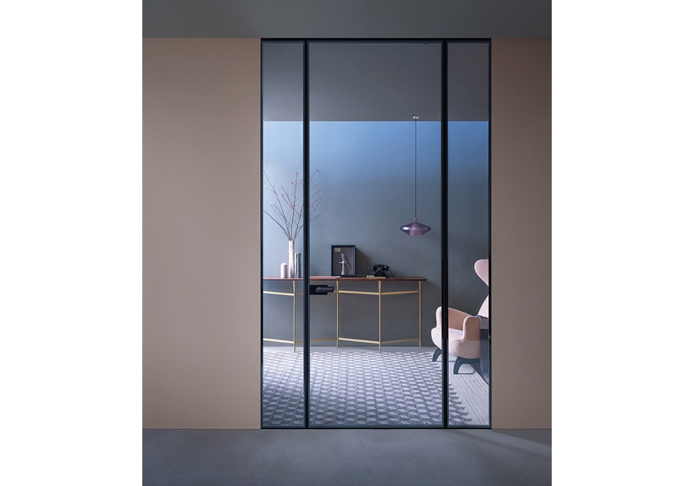 Shoin Pivot firmata e prodotta da Lualdi è una porta a bilico in vetro con telaio in alluminio, è un sistema divisorio che si propone di delimitare gli ambienti della casa o dell’ufficio con una presenza solida e, al contempo, quasi intangibile. Disponibile in differenti finiture.