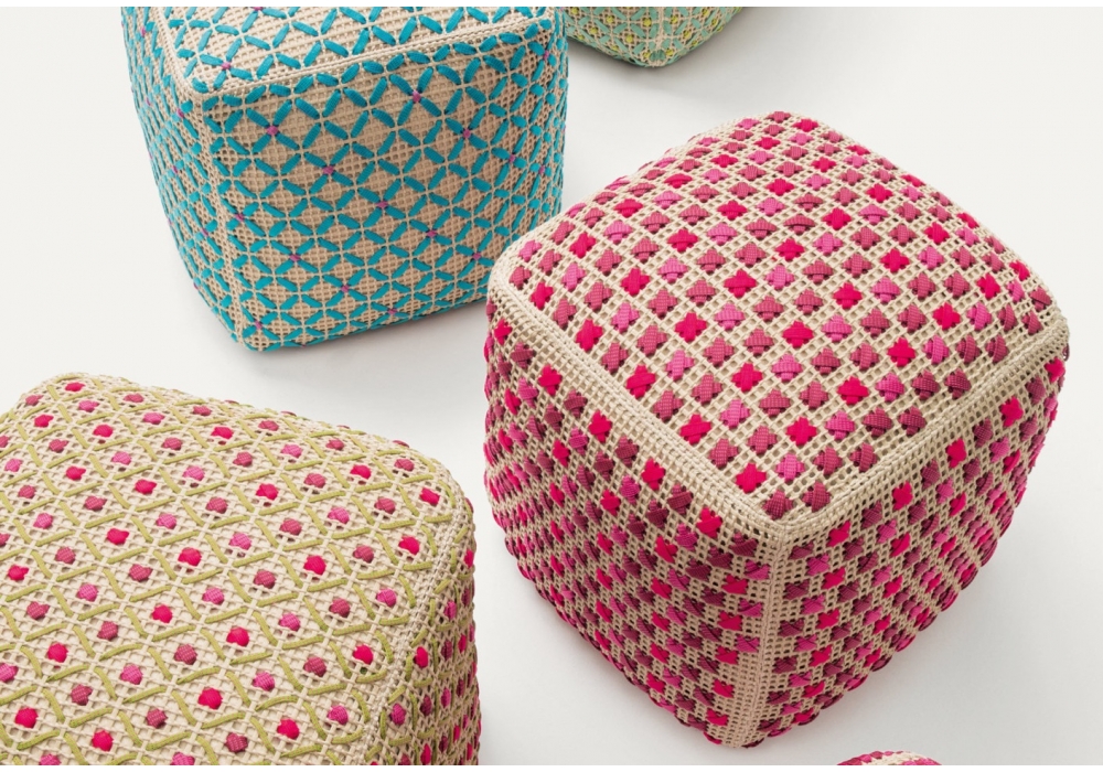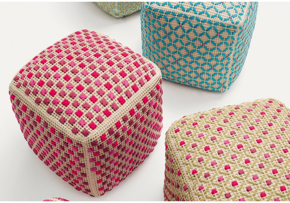 Spezie firmato da Marella Ferrera è un bellissimo pouf imbottito con rivestimento sfoderabile in tessuto Kimia nei colori sand o basalto, ricamato a mano con corde piatte in filato Rope 10. Disponibile in 2 dimensioni. Spezie può anche essere completato da uno schienale indipendente.