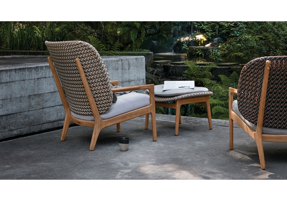 Kay firmato da Henrik Pedersen per Gloster è un poggiapiedi con struttura in teak e seduta in vimini intrecciato. Cuscino seduta in tessuto outdoor incluso.