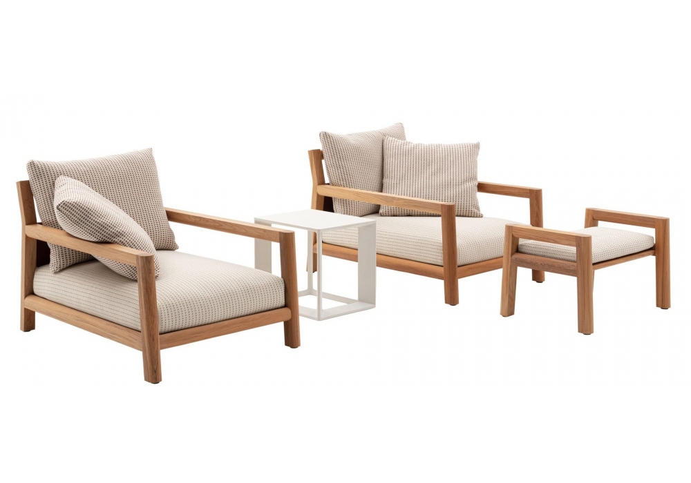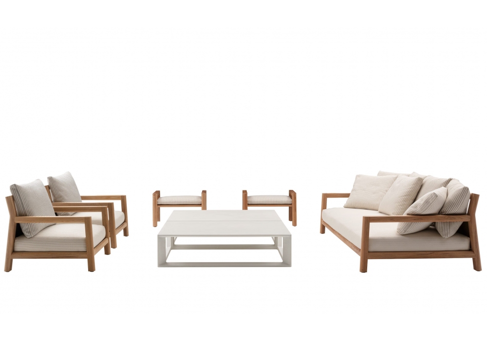 Pablo firmato da Vincent Van Duysen per B&B Italia Outdoor è un pouf con struttura in legno di teak naturale e cuscino di seduta disponibile con rivestimento in tessuto.