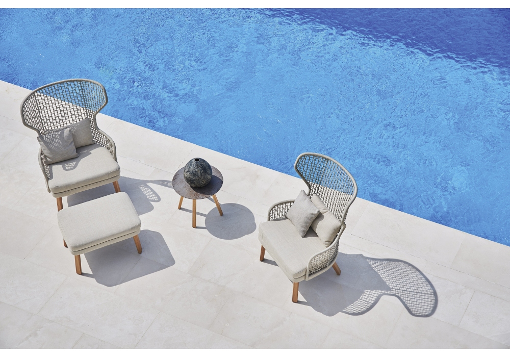 Emma firmato da Monica Armani per Varaschin è un pouf outdoor con gambe in alluminio o iroko massello. Seduta tappezzata in tessuto con struttura sedile di polipropilene. Schienali con telai di alluminio verniciati a polveri intrecciati o in multistrato di legno per esterni e rivestiti in tessuto. Disponibile in differenti finiture.