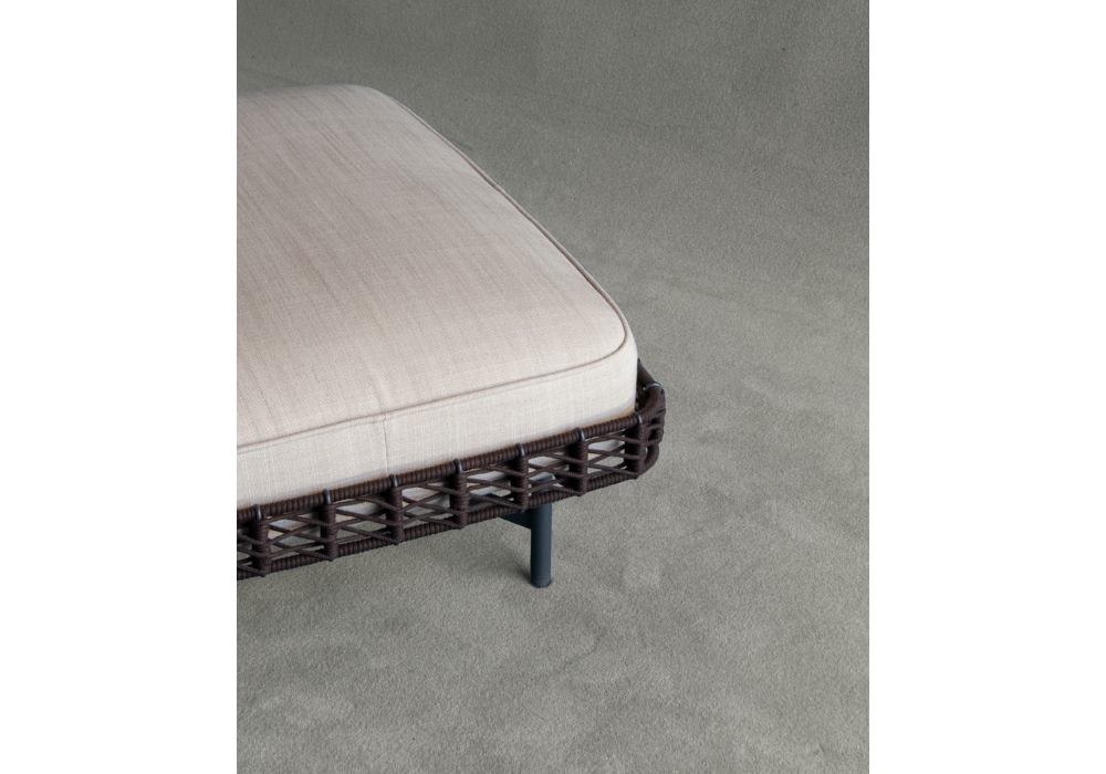 Ropu Outdoor firmato da Chiara Andreatti per Potocco è un pouf rettangolare da esterno con struttura in metallo verniciato antracite goffrato e cornice con intreccio in cordino “Gassa” testa di moro. Cuscino sfoderabile imbottito in poliuretano espanso ignifugo con rivestimento in diversi tessuti.
