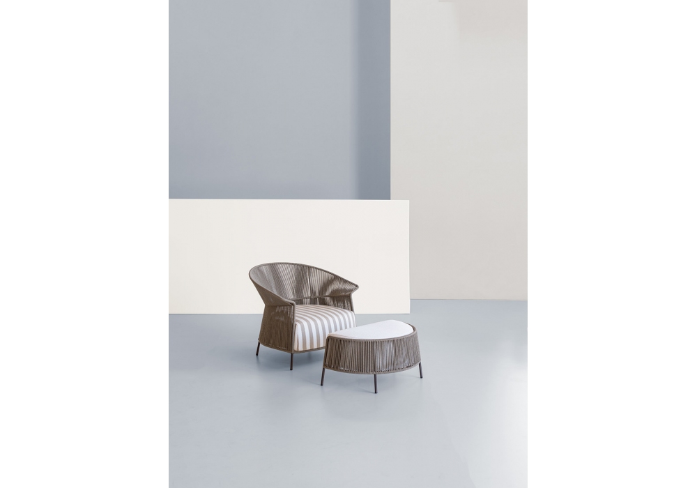 Ola firmato da Radice Orlandini per Potocco è un pouf da esterno struttura in tondino di metallo verniciato a polvere per esterno intrecciato a mano in fettuccia “Fly”. Il cuscino di seduta è imbottito in poliuretano espanso ignifugo e ovatta poliestere; il sottofodera in tessuto è impermeabile con cuciture sigillate; fodera finale in tessuti outdoor.