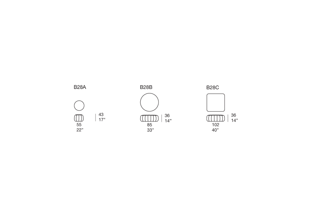 | Dimensioni | Ø 55 x H 43 cm; Ø 85 x H 36 cm; 102 x 102 x H 36 cm. |