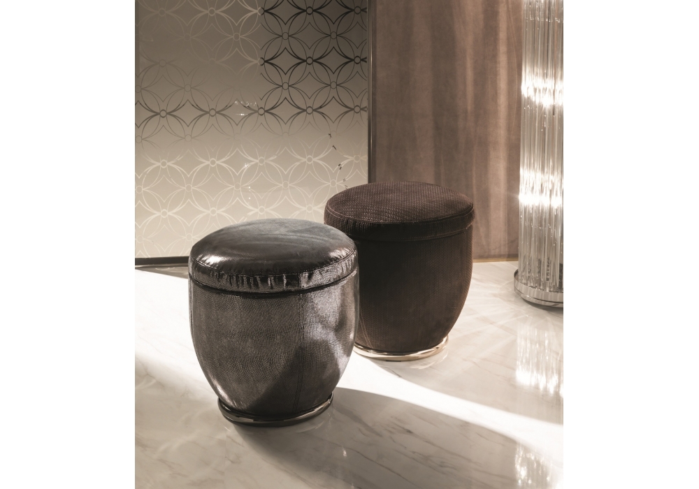 Godwin firmato da Giuseppe Iasparra per Longhi è un pouf con struttura in vetroresina e sedile in legno e poliuretano espanso ad alta densità. Base in metallo in diverse finiture. Rivestimento in tessuto o pelle non sfoderabile.
