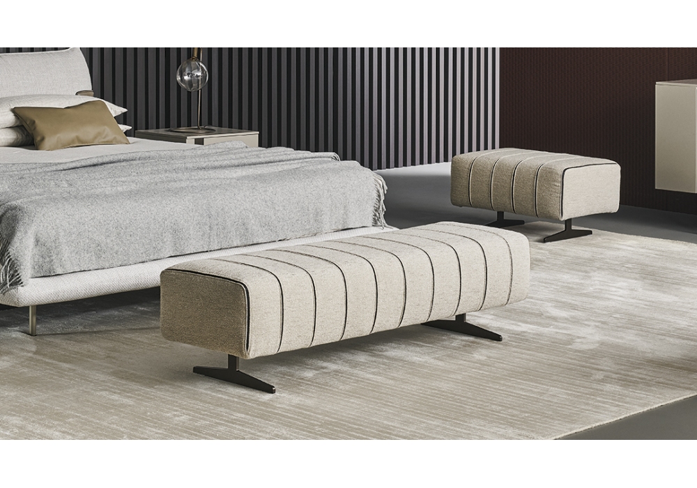 Mark firmato e prodotto da Bonaldo è un pouf con struttura interna in legno e conglomerato di legno, imbottitura in poliuretano espanso sagomato a varie densità, con fodera in vellutino accoppiato a fibra di poliestere. I piedi sono in metallo verniciato opaco in più colori. Il rivestimento è sfoderabile e disponibile in diversi tessuti e colori, con inserti in pelle. Il pouf è realizzato in varie dimensioni.