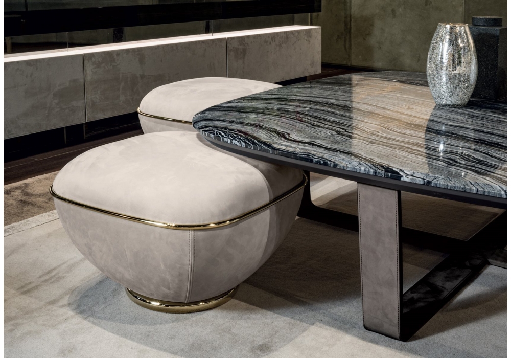 Sigma firmato da Elle Studio per Longhi è un pouf con struttura in legno ricoperta in poliuretano espanso a densità media con anello in metallo lucido o opaco. Rivestimento in pelle o tessuto non sfoderabile.