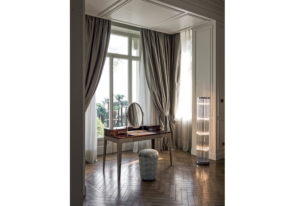 Teo firmato da Elle Studio per Longhi è un pouf con struttura in legno ricoperta in poliuretano espanso a densità media con anello in metallo lucido o opaco. Rivestimento in pelle o tessuto non sfoderabile. Disponibile nella versione liscia o lavorazione a pieghe raggiate. Su richiesta il pouf da Ø 50 x H 48 può essere realizzato con rivestimento effetto Capitonné.