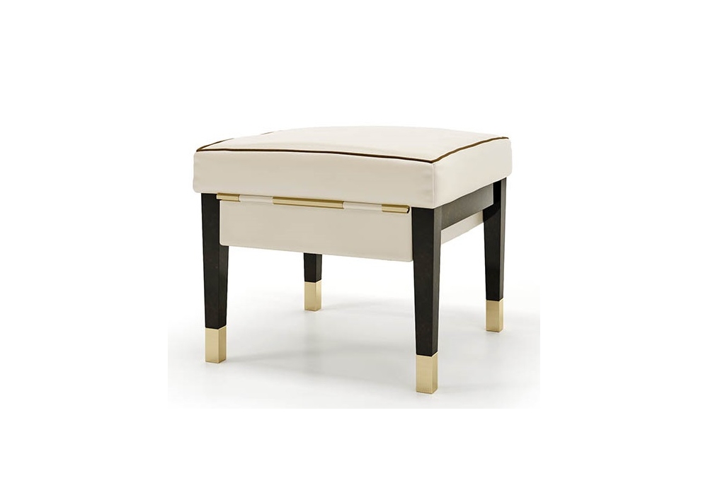 Noir firmato da Andrea Bonini per Turri è un pouf con gambe in multistrato e legno massello in finitura poliestere lucido decorato a mano. Cuscinatura in poliuretano espanso con rivestimento in differenti tessuti o pelli. Parti metalliche in finitura oro chiaro o bronzo.