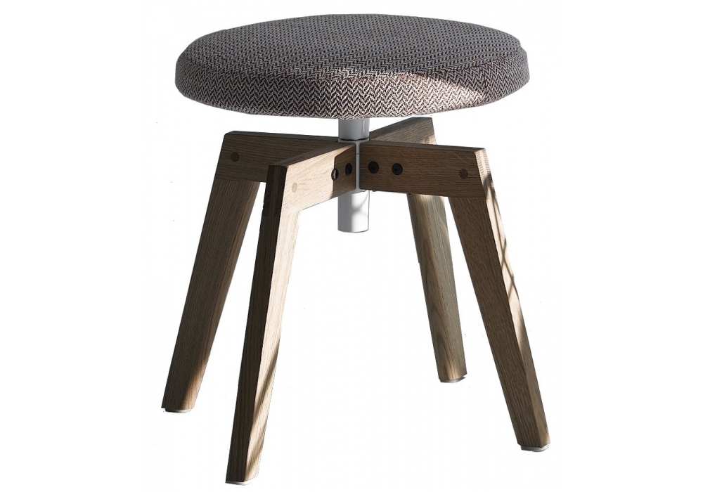 Flow Pouf con imbottitura in multistrato rivestito da poliuretano e ovatta e rivestimento sfoderabile è disponibile con 4 gambe in rovere. Struttura in massello di rovere naturale laccato trasparente, disponibile nelle finiture naturale, marrone o sbiancato, con supporto di aggancio in alluminio verniciato bianco o grigio grafite opaco. Girevole a 360°. Altezza di seduta disponibile: 48 cm.