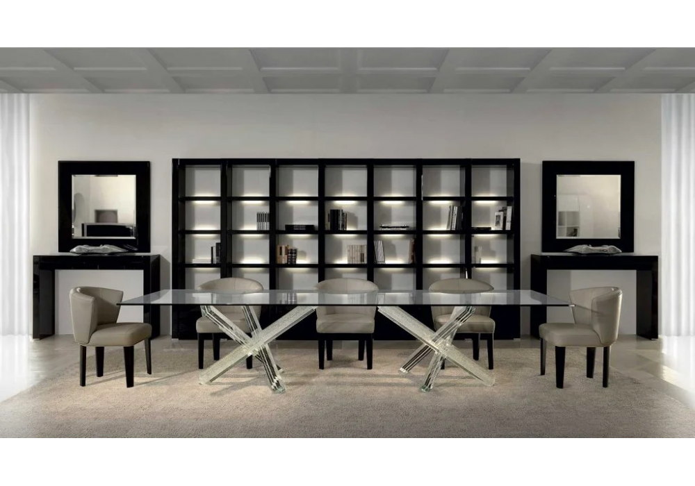 Avantgarde firmata da Reflex Angelo è una libreria componibile in legno laccato lucido con applicazioni in vetro bisellato laccato sui frontali, oppure in legno ebano lucido. Schienali disponibili in vetro laccato bianco, specchio Antique o in vetro Marmo. Sistema di illuminazione opzionale.