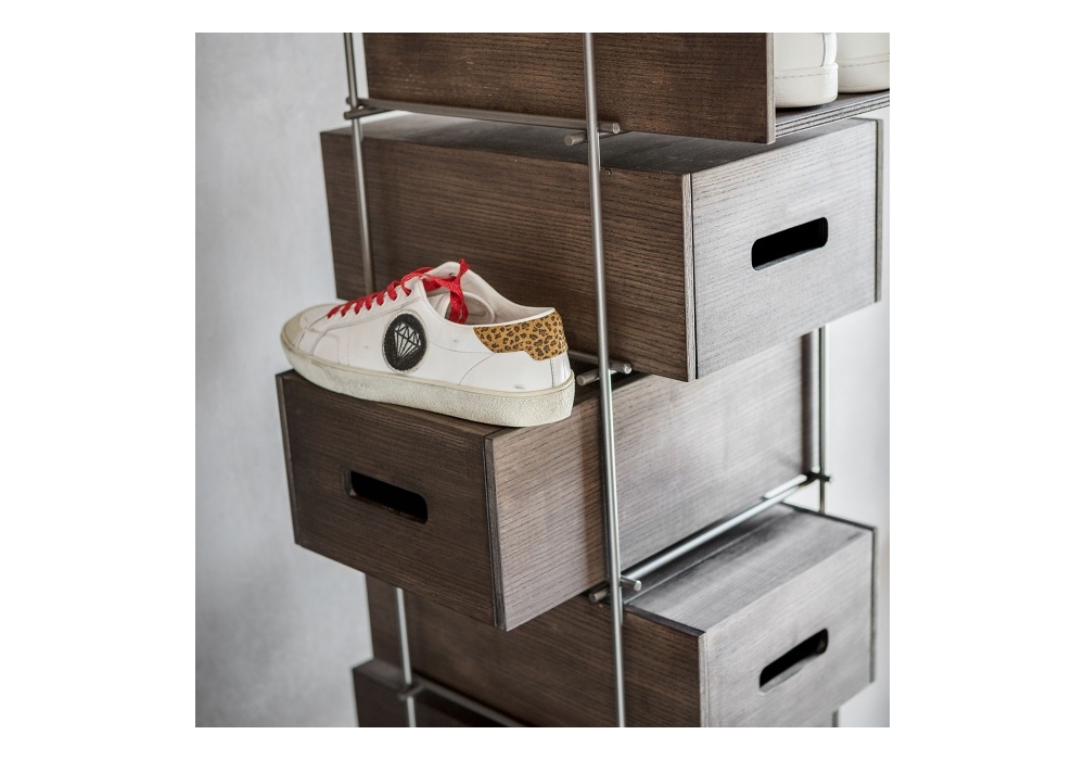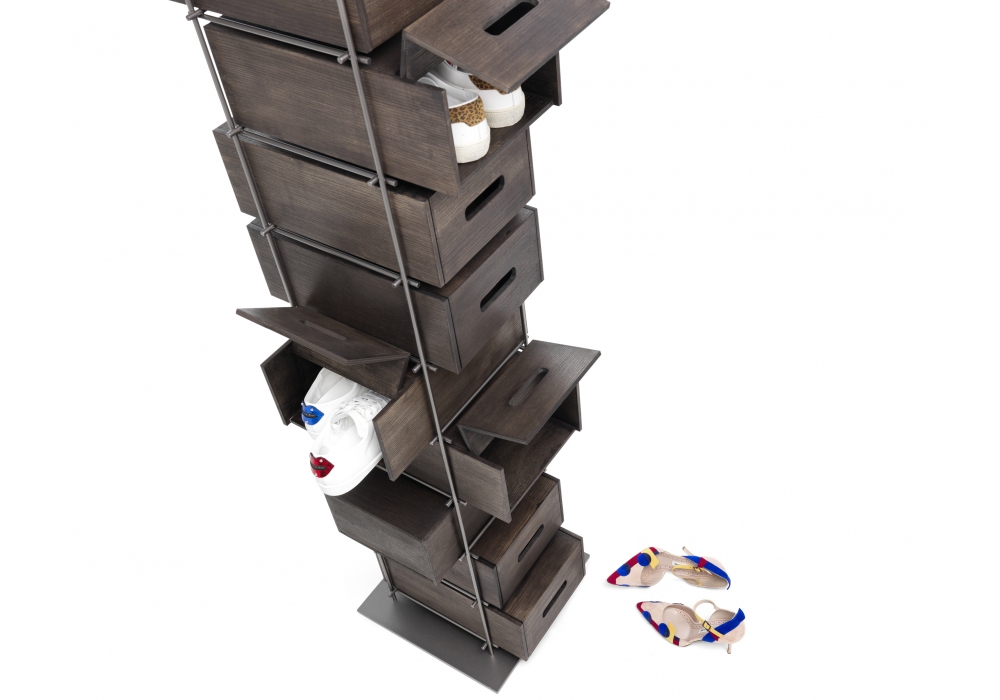 Manolo firmata da Idelfonso Colombo per Mogg è una scarpiera con struttura in metallo in finitura brunita e contenitori in legno massello di frassino tinto moka.
