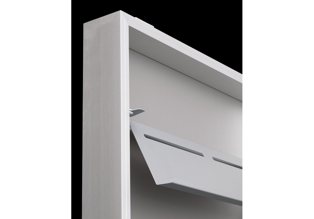 Foot Box firmata da Luciano Bertoncini per Kristalia è una scarpiera realizzata con struttura in alluminio, anta frontale con specchio, finitura ripiani interni in lamiera verniciata grigio Londra e appendiabiti in acciaio inox.