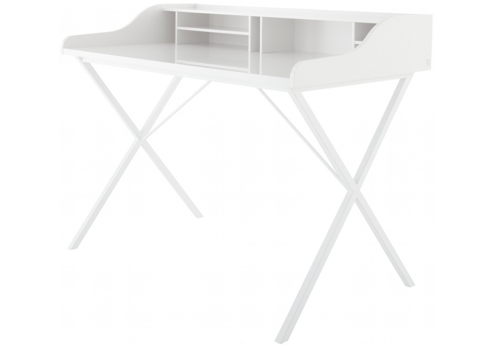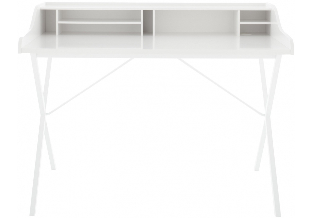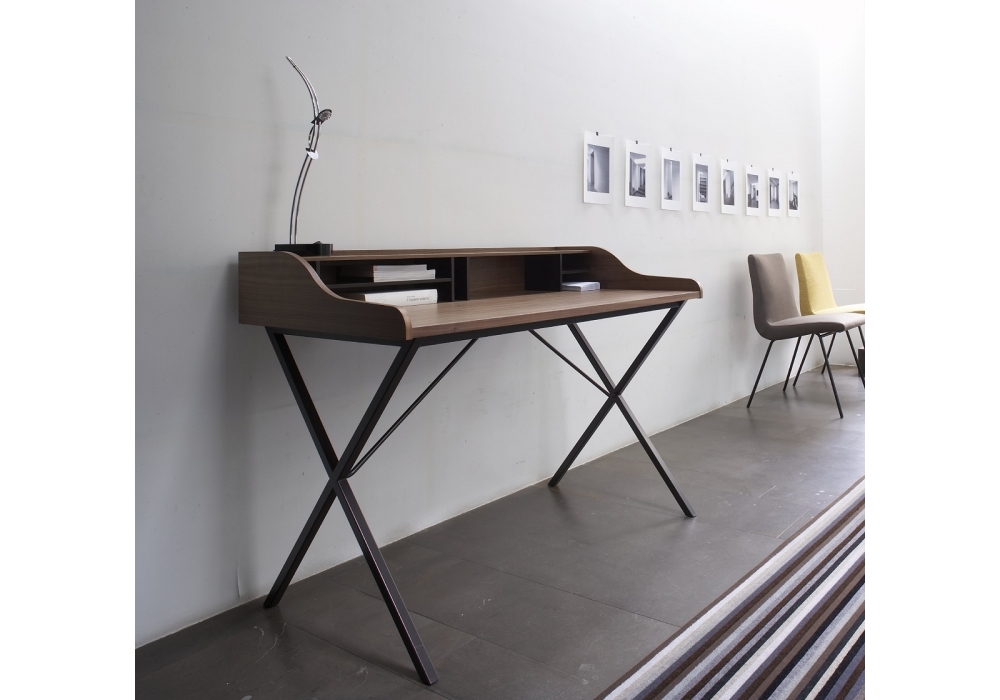 Ursuline è la scrivania firmata da Pierre Paulin per Ligne Roset. Questa graziosa scrivania da appartamento dalla linea femminile completa la scrivania Tanis (1954 / 2008) più severa e mascolina. Scrivania costituita da un piano di lavoro con scomparti e cintura in pannelli di truciolare e MDF. Gambe a croce in tubo d'acciaio laccato epossidico. Finitura: tutta laccata bianco satinato o piano e cintura placcati noce naturale con base e cassetti laccati marrone satinato.