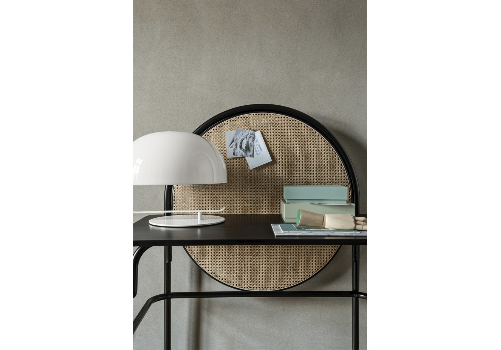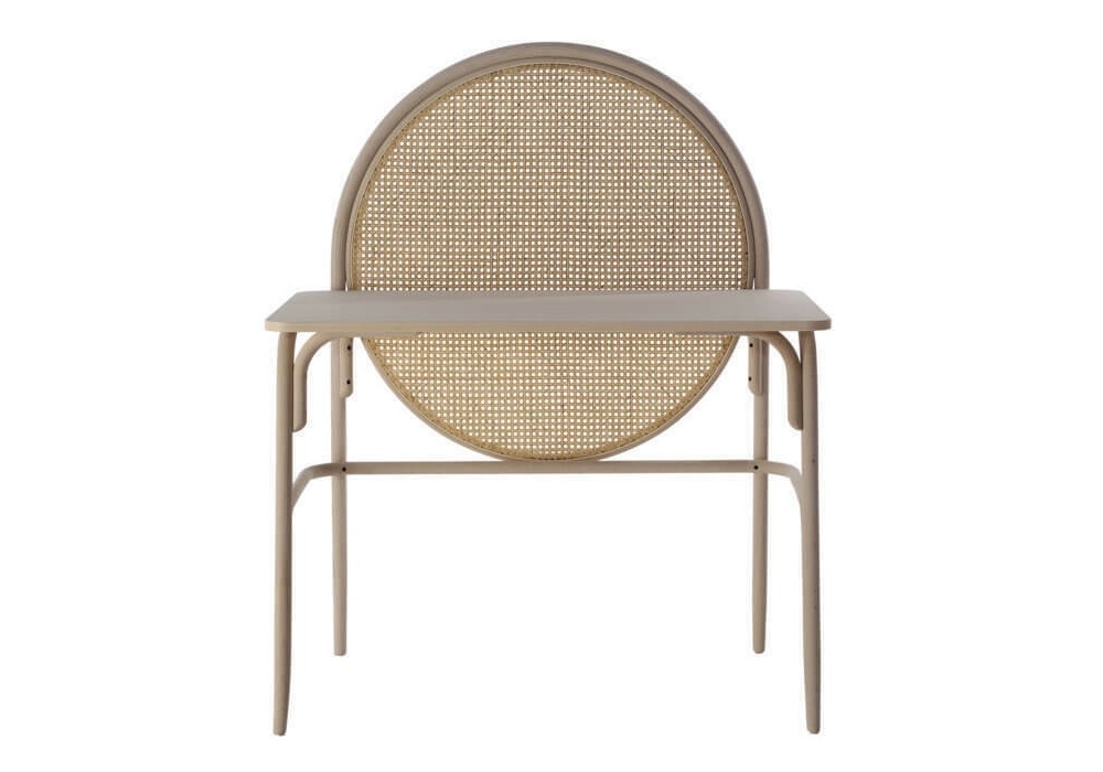 Allegory Desk firmato da Gamfratesi per Gebrüder Thonet Vienna è uno scrittoio con struttura in faggio curvato e piano impiallacciato in frassino verniciato. Elemento decorativo circolare in paglia di Vienna. Disponibile nella versione con o senza cassetto.