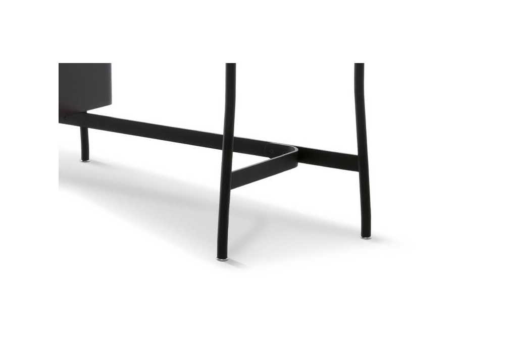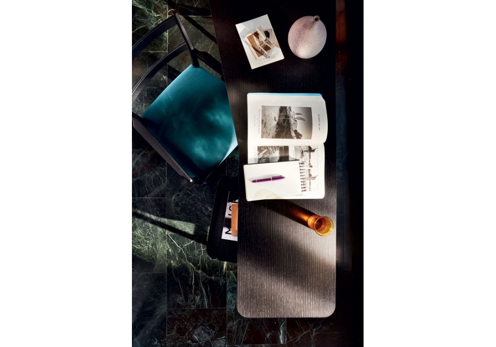 L40 Sled firmato da Rodolfo Dordoni per Cassina è uno scrittoio con piano sagomato in rovere tinto scuro sinistro o destro e cassettiera in legno tinto nero sinistra o destra, con cassetto dotato di vassoio interno.