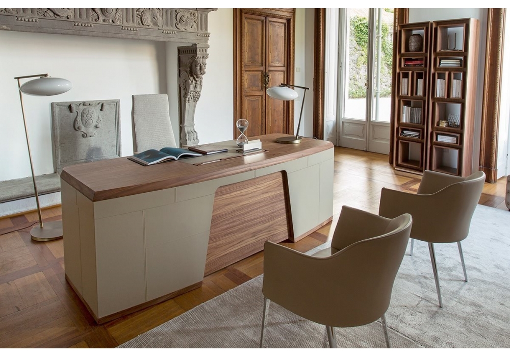 Flavio firmato da U. Asnago per Porada è uno scrittoio direzionale in noce canaletta con struttura esterna rivestita in cuoietto e struttura interna in legno. Piano con inserto in cuoietto con cuciture a vista. Sul piano è prevista una vaschetta portamatite a più vani. Attrezzato sul lato destro con pianetto estraibile push/pull, anta con serratura e ripiano interno in legno. Sul lato sinistro sono previsti un tiretto portamatite con apertura push/ pull, due cassetti e un cassetto portacartelle con chiusura rallentata. Maniglie in legno.