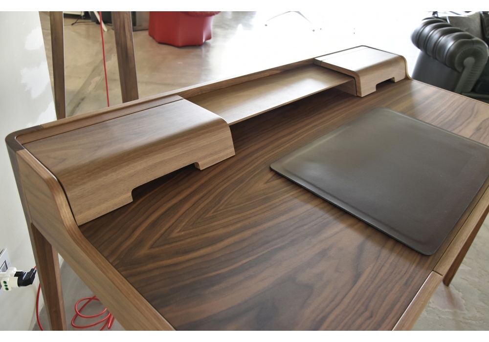 Saffo firmato da Carlo Ballabio per Porada è uno scrittoio in massello di noce canaletta caratterizzato da vani portaoggetti a scomparsa, cassetto centrale e sottomani in cuoietto disponibile in diverse finiture.