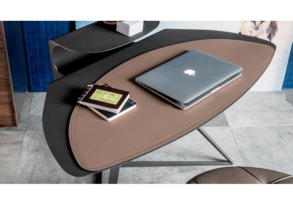 Storm firmato da Andrea Lucatello per Cattelan Italia è uno scrittoio realizzato in acciaio verniciato goffrato titanio, bianco o graphite. Pad rivestito in cuoio disponibile in diverse finiture.