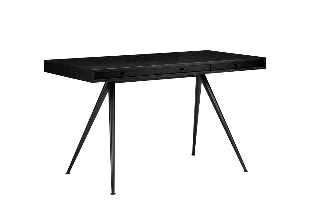 JFK Desk firmato da Kristian Sofus Hansen e Tommy Hyldahl per Norr11 è una scrivania con gambe in metallo nero e il top in legno di frassino nero.