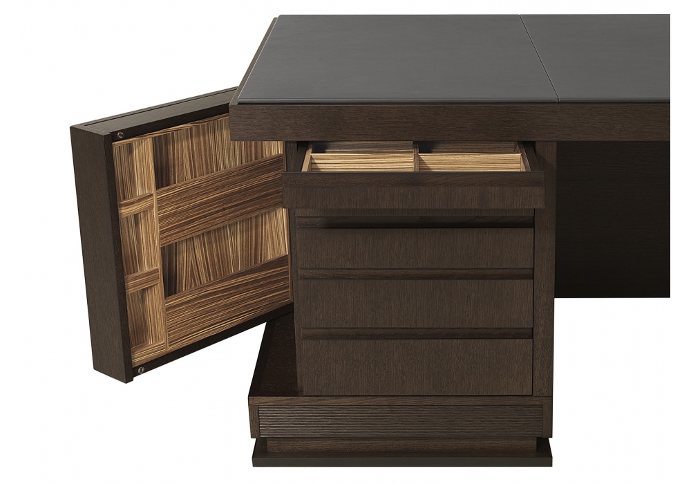 I.C.S. firmato da Roberto Lazzeroni per Ceccotti Collezioni è uno scrittoio con 5 o 10 cassetti e anta/ante laterali attrezzate con portadocumenti in acero, realizzata in massello di noce americano e multistrato di pioppo impiallacciato. Basamento in acciaio inox satinato. Piano scrittoio in pelle L 220 diviso in 3 parti. Disponibile anche in diversi modelli. Accessori aggiuntivi opzionali.